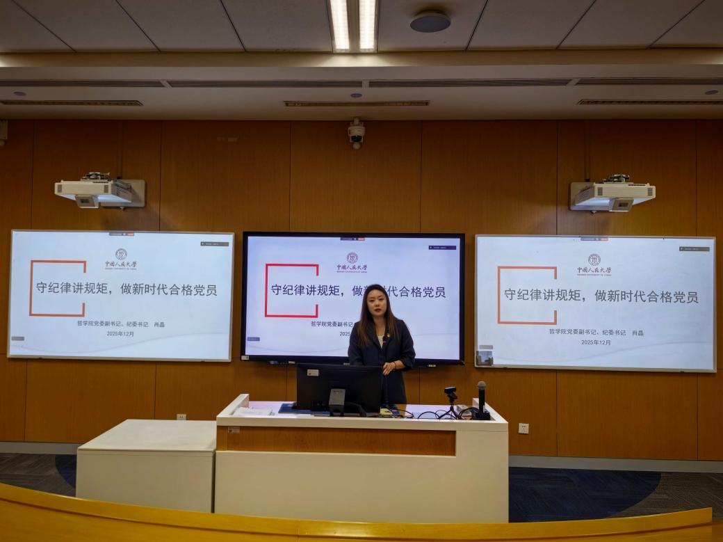 日期:2025-12-2212月18日下午,哲学院2025年秋季学期预备党员培训班第二讲在中关村校区立德楼703教室举行。哲学院党委副书记、纪委书记肖晶老师以“守纪律讲规矩,做新时代合格党员”为主题讲授专题党课。
