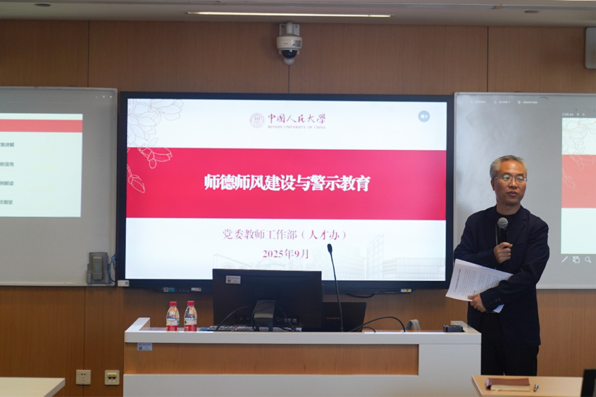 日期:2025-09-279月25日上午,哲学院2025年秋季学期师德师风建设与警示教育大会在立德楼901召开。学院特邀中国人民大学党委教师工作部(人才办)副部长(副主任)田晓晖教授作师德师风建设专题讲座,学院党委书记石德才主持会议,学院全体教职工参会,共同筑牢师德师风建设思想防线。