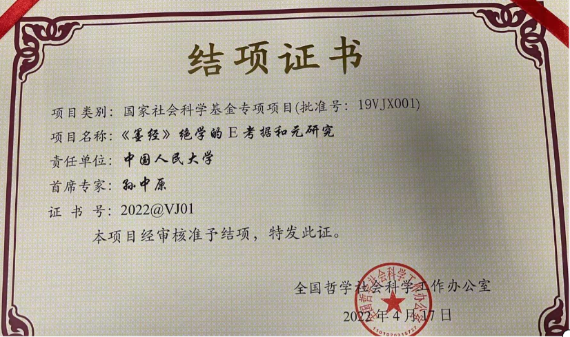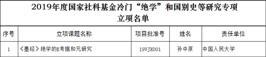 孙中原任2019年国家社科基金研究专项《<墨经>绝学的E考据和元研究》首席专家。2019.10.15立项,批准号19VJX001。2022.4.17批准结项,批准号19VJ001,证书号2022@VJ01。