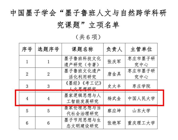 近日,经会议评审、社会公示等程序,中国墨子学会公布2026年“墨子鲁班人文与自然跨学科研究课题”立项名单。哲学院杨武金教授“墨家逻辑思想与人工智能发展研究”获批立项。