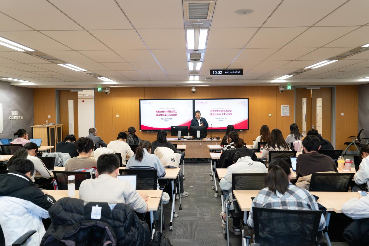 日期:2025-12-17为深入学习贯彻党的二十届四中全会精神,12月12日,“十五五”十五讲形势与政策讲座《激活文化创新创造活力 建设社会主义文化强国》在立德楼1002顺利举行。本次讲座由哲学院、马克思主义学院、党委学生工作部(处)主办,哲学院院长臧峰宇教授应邀主讲。哲学院党委书记石德才,党委副书记、纪委书记肖晶参加活动。讲座由哲学院团委书记蔡欣欣主持。